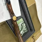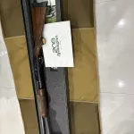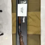 - Beautiful D-grade walnut stock with Fleur-de-Lis checkering, medallion in the grip cap — woodwork is elegant, with warm tones that contrast elegantly with the blued steel and gold inlay.