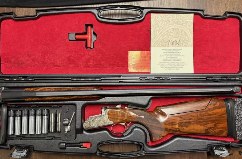 12 gauge, 30" barrels Caesar Guerini Invictus III Ascent (mid-rib). Engraved action and oil finished upgraded wood. Monte Carlo stock with adjustable comb. Includes: 10 chokes, thin and thick recoil pads, hard case, gun slip, gun socks, and tools.
