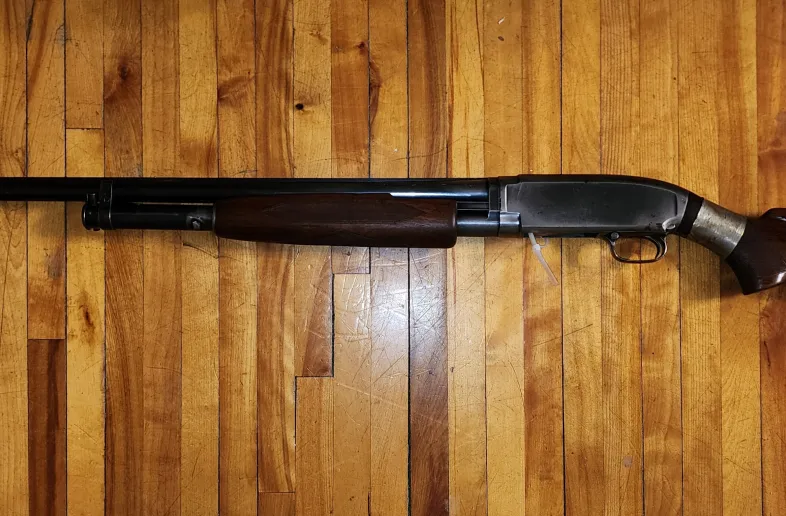 WINCHESTER, MODEL: 12 TRAP, CALIBER: 12 G X 2 3/4", COMES WITH SOFT CASE. BORE IS EXCELLENT. FIXED FULL CHOKE. SILVER FRONT AND MID RIB BEADS, SOLID RIB, BLUED FINISH. TWO PIECE WOOD STOCKS, CHECKERED FOREARM, CHECKERED PISTOL GRIP CRACKED AND REPAIRED WITH BRASS WIRE AND SOLDER, RED RUBBER RECOIL PAD. METAL FINISH SHOWS SOME LIGHT RUST SPOTS, SCRATCHES, HANDLING MARKS AND WEAR. STOCKS SHOW MARKS, SCRATCHES AND WEAR. ACTION: PUMP ACTION SHOTGUN, BARREL LENGTH: 30", manufactured in 1938 Winchester register confirmed date with serial number, CONDITION: 6/10, CLASS: CANADIAN NON RESTRICTED, shipping at your expanse