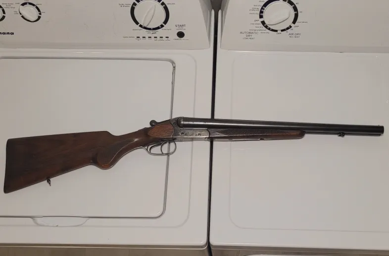 This is an East German SxS shotgun, in good condition. I bought it a few years ago from Great North Gun Co, they called it the "Great North Coach Gun". They had the barrels professionally cut to 18" and a bead sight installed. Chambers are 12 ga 2 3/4", and it has extractors. Some dings in the wood and scratches in the metal but it looks very nice for its age. Quite a unique and handy gun (about as short as a 14" barrel pump!). The action locks up tight with no play, and there are no cracks in the wood. No mechanical issues. Selling because I don't shoot it enough. Shipping on buyer, or come pick it up in Regina. Thanks for looking!