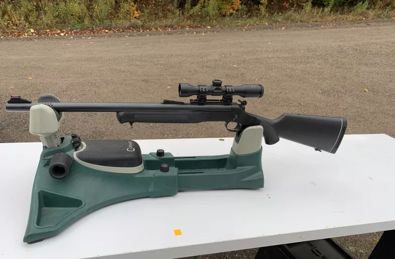 Rossi 20ga single shot. Has a rifle barrel with a built in mussel brake. Barrel has groves in it to shoot 3" rifle slugs. Has a 4x32 Simmons Scope.