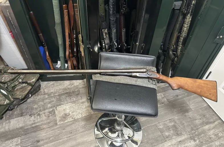 Antique Damascus double barrel. Seems to function but too smart to try. Not to be used with modern 10 gauge ammo. I can see faint engraving but cannot determine the manufacture.