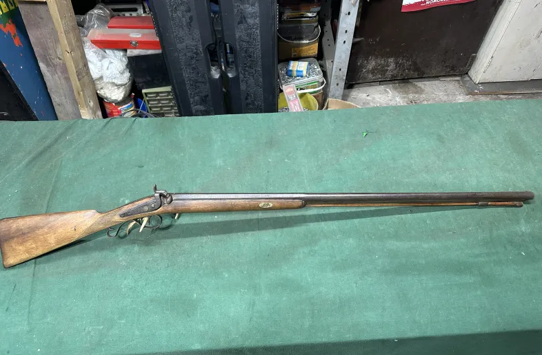 Super long antique status 12 gauge percussion. 39” barrel, nice engraving, octagon breach, ram rod intact, original and unrestored condition without any damage or repairs, fully functioning with a nice strong mainspring and damage free nipple. Shipping available.