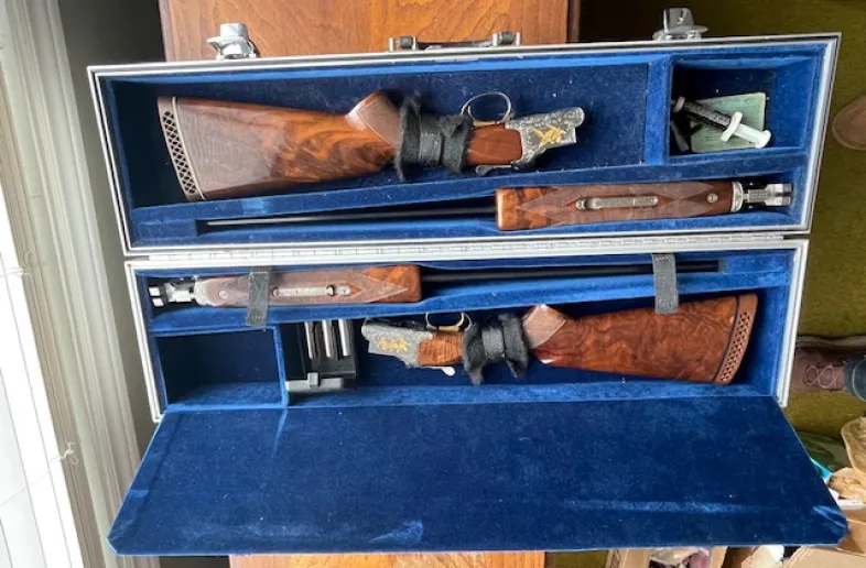 Browning matching Grade 6 Citori’s from early 90’s, not matching serial numbers. Both have the Beavertail forearms and 28 in. barrels. The 410 has fixed Sk/Sk chokes. The 28 ga had Briley factory installed thin wall choke system, 2-Sk,2-Mod and 1-IC chokes included. Both guns have gold inlays and beautiful engraving! The 410 was barely used, the 28 ga more so, but both guns are in excellent condition. Will not sell separately, both in the one case only.
