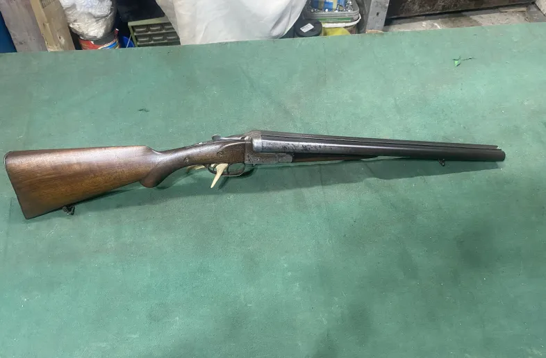 Belgian Leige 12 gauge side by side coach gun. 18” barrels, stock was repaired but holds tight, lock up is tight as well, side locking pin, sling swivels, shoots great. Nice cheap coach gun. Shipping available.