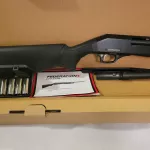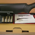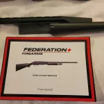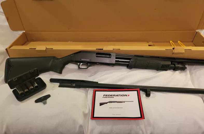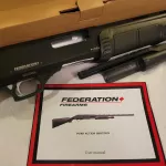 Brand new in the box. Federation Firearms Pursuit Combo. 12 gauge textured synthetic stock. Dual barrel system. 28" raised vent rib. 24" fully rifled cantilever barrel with red fiber optic sight. Dual bar pump. Set of Five (5) stainless Mobile chokes. Full, I/M, Mod, I/C, Cyl and case. Never fired. Very nice gun. Shipping available. Please contact for any additional information.