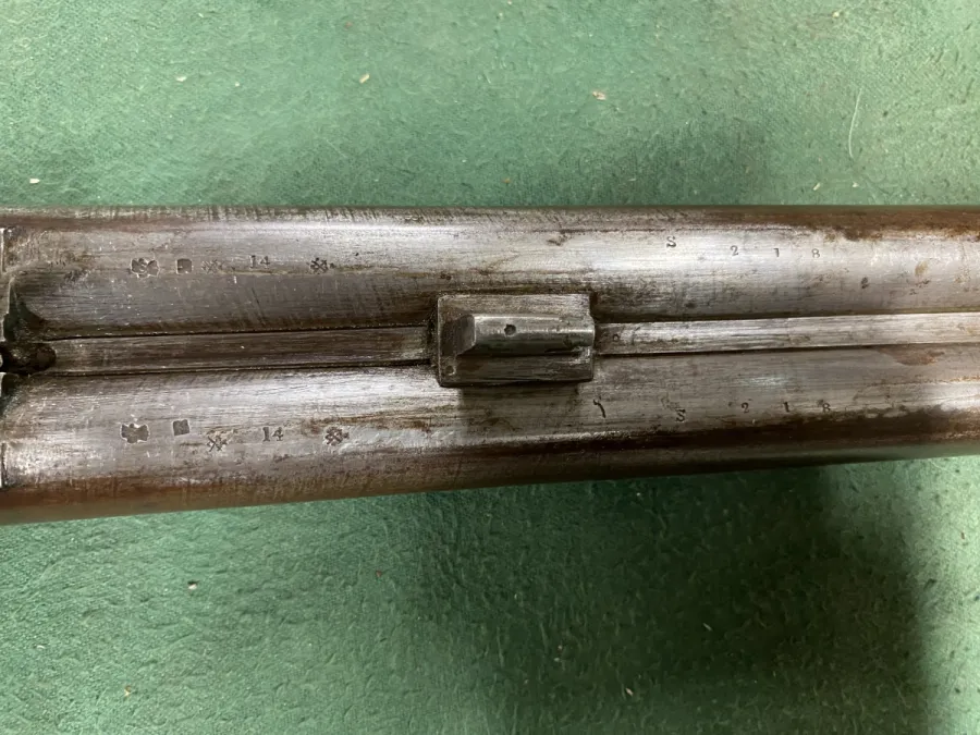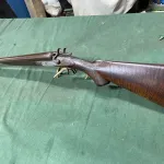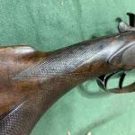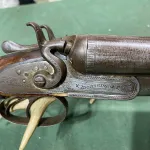 Side by side 12 gauge external hammers, vanity plate, nice engraving, tight lock up and fully functioning. Crack repaired at wrist that holds well and looks very well, 30” laminated steel barrels, cyl bore chokes. Shipping available.