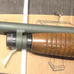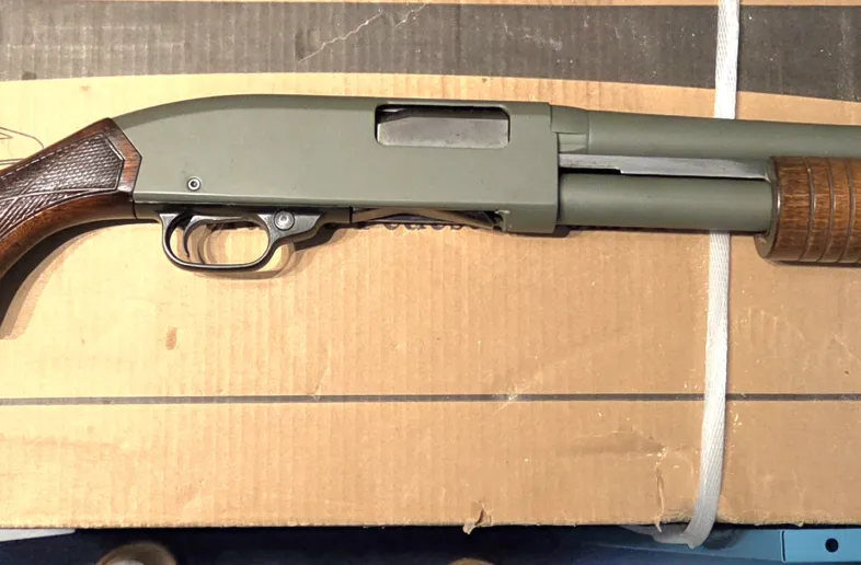 FOR SALE is a Winchester Riot copy made from a Winchester 120 Ranger shotgun. 12 gauge, 19" barrel cylinder bore tastefully made from the factory 30" barrel. Rattle can Krylon Olive Drab Green that looks really sharp. The ugly birch canoe factory stock was swapped out for a good looking walnut stock from a trap gun, and has the desirable corn cob pump. These are still some of the fastest pump shotguns around. Get an American made classic for less than a Turkish clone. $350 and shipping is on you.