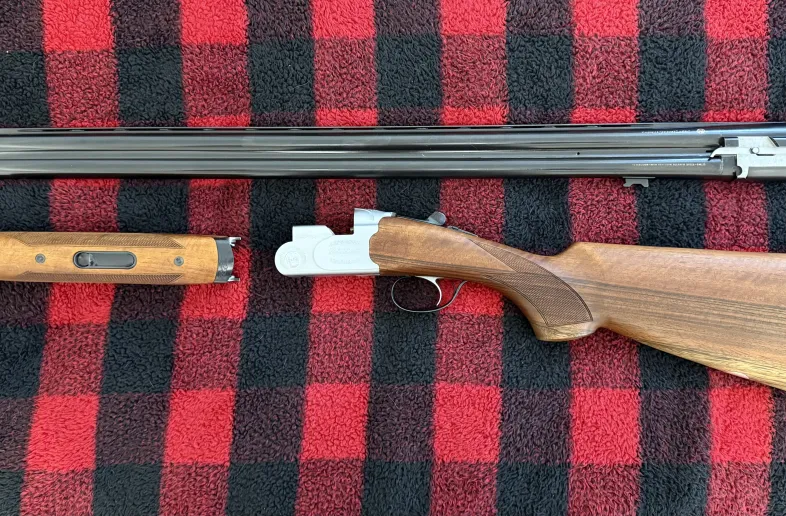 First, the barrels were sent off to Ribstone Gunsmithing to have the sling swivel removed and then slow rust blued to clean up some bluing loss on the barrels. The slow rust blue looks better than the factory original. Once returned, the original brass bead was replaced with a Beretta genuine red optic sight that was purchased from Stoeger. Ejectors were polished and the timing is perfect.