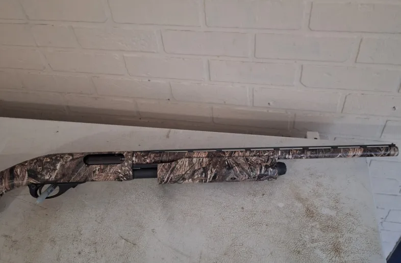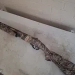 Wood stock, gun has been wrapped with mossy oak camo grass duck blind vinyl 6 inch wrap tape. By a previous owner.