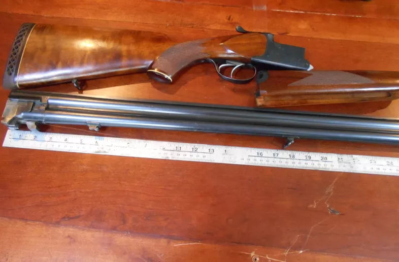 Baikal Cal 12, Magnum 3 inc. Barrel length 29 inches, these are extractors and not cartridge ejectors there are no handling marks no rust and no cracks on the stock the choice of select walnut chosen is select beautiful ribs, beautiful wood grain, Deep Blue , the finish is original the breech is engraved with hunting scenes it is in my possession for a very very long time , very little used