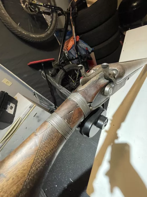 Stock has a crack in it and has been bound with wire, looks like a long time ago.
