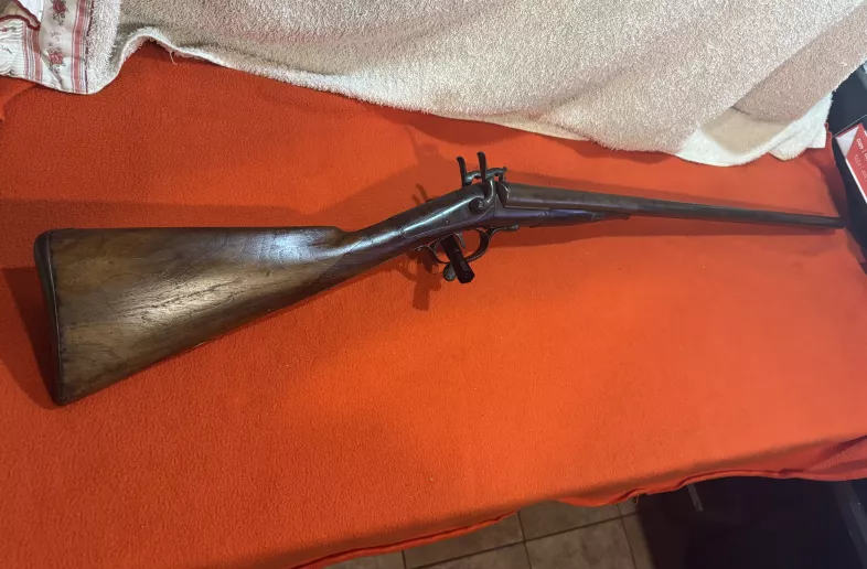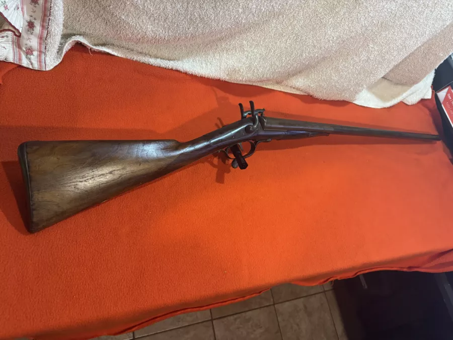 J. WHITE & SON - 12 GAUGE DOUBLE PERCUSSION SHOTGUN. DAMASCUS TWIST BARRELS. ENGLISH MADE SHOTGUN WITH 30" BARRELS. HAS UNDER LEVER TO OPEN. SOLID. CLOSES TIGHT. HAS NOT BEEN TESTED - SOLD AS IS. NO TRADES. $800 PLUS SHIPPING. PAYMENT - LAYAWAY PLAN AVAILABLE. CHECK OUT MY OTHER ADS.