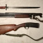 The bayonet is a replica. This is a take-down, and, there is a little play between the receiver and barrel. Gunsmith checked it and said it is safe to shoot. The sling buckles are very rusted. It's not the real deal - but it is a very interesting piece! Slam fires!