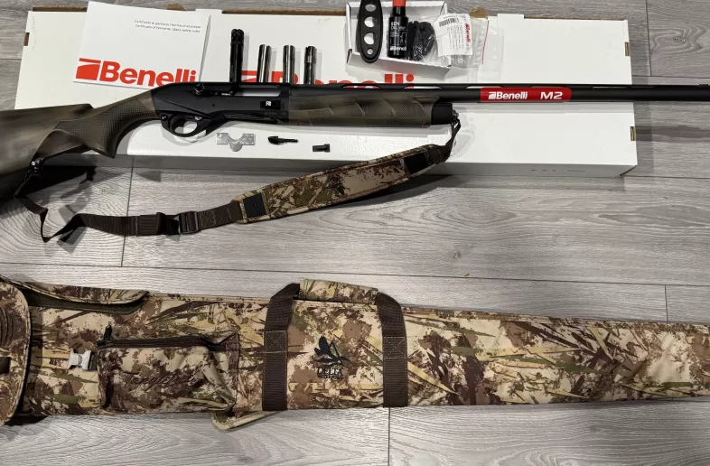 Rob Roberts custom 2023 Delta Gun of the Year Benelli M2. This is number 230 of 330. Gun has been taken out about 4 times. In Excellent condition. Has Rob Roberts custom Cerakote Camo, custom bolt handle and and bolt release along with Rob Roberts T2 Choke. Included is the soft case and sling in First Lite Typha, all original parts (bolt handle, release and criochokes) and a Carlson't Turkey choke.