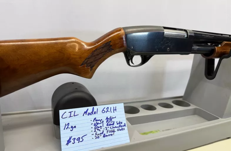 CIL Model 621H in 12 ga pump action in good condition. Has a vent rib, bead site, 2 3/4” to 3” chambered, 30” barrel and fixed FULL choke. Shipping and insurance by purchaser, valid PAL verification required.