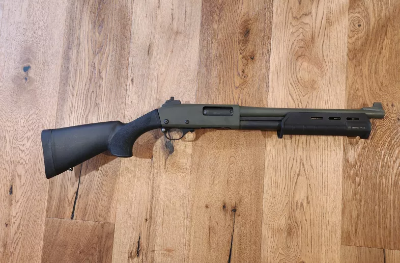 I added scattergun tech ghost ring sights, extend safety, magpul MOE foregrip, GGG sling adapter, generic 4 round side saddle, and hogue short LOP buttstock.