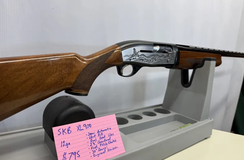 SKB XL900 in 12 ga semi automatic in Very Good Condition has some marks from normal hunting usage. Has a vent rib, dual bead sites with fluorescent front bead, engraved receiver, Manufactured in Japan, 2 3/4” chambered, 30” barrel, manufactured by Ithaca, and a fixed FULL Choke. Shipping and insurance by purchaser, valid PAL verification required.