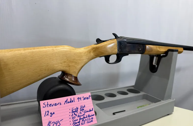 Stevens Model 94 Series P in 12 ga single shot break action in Excellent condition. Has a bead site, 2 3/4” to 3” chambered, 30” barrel, ejector, Case Hardened Patina receiver, flared hard wood pistol grip, And a fixed full choke. Shipping and insurance by purchaser valid Pal Verification Required.
