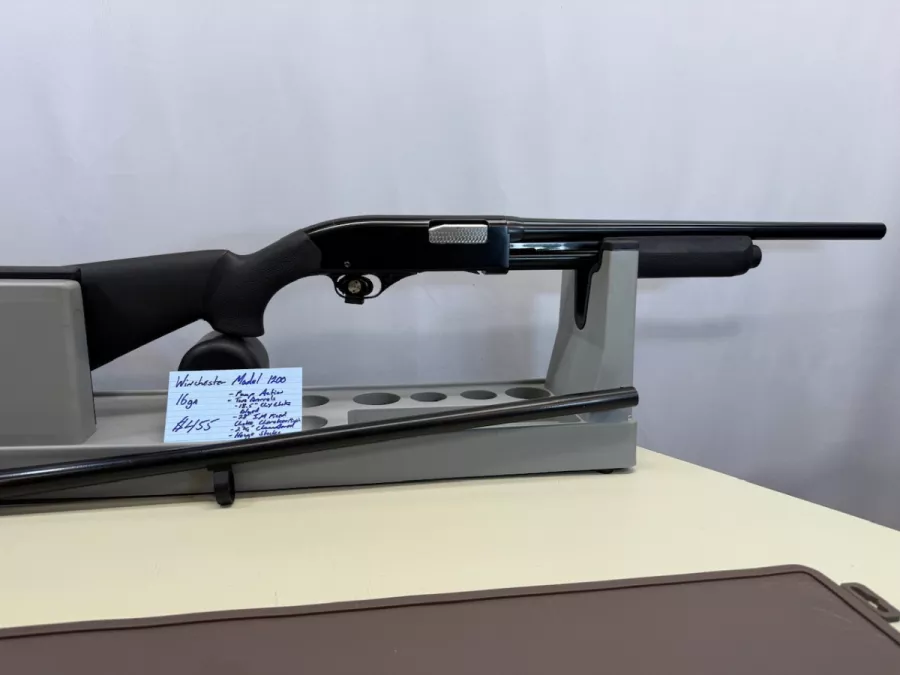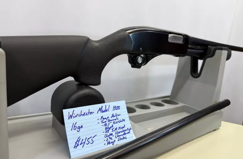 Winchester Model 1200 in 16 ga pump action in Very Good Condition. Comes with two barrels, the blued barrel is CLY Bore defender 18 1/2” barrel and the Cerakote/Paint Finished barrel is Fixed IM choke with bead site, and Has Hogue Stocks, single rear sling mount and is chambered in 2 3/4”.