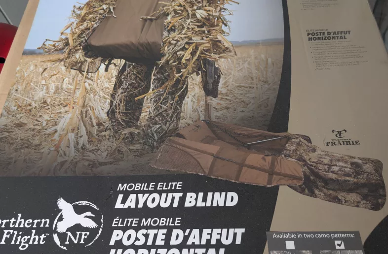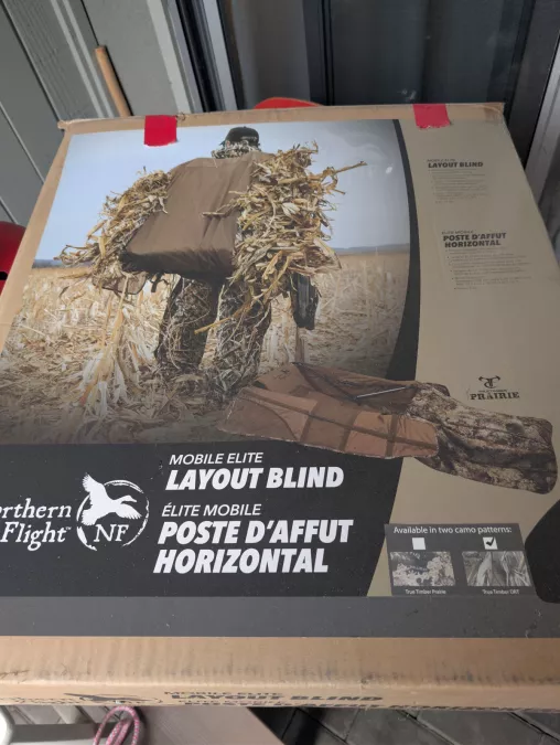 Brand new never used. Box was opened to view the contents. I just don't hunt with a laydown blind.