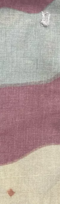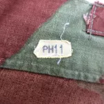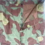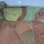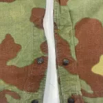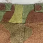 These trousers are in the post-WWII version of the Italian Army 'Modello 1929 Telo Mimetico' camouflage pattern introduced circa 1950 and used until circa 1985-1990. They are faintly stamped in black ink on the inside of the front left of the waistband, including with what may be a 1962 date. There is a small white tag stamped in black ink with the inscription "PH11" on the inside of the rear right of the waistband. All metal snap fasteners and plastic buttons are present (including on the buttoned fly). The built-in suspenders have unfortunately been cut at the rear of the waistband by a previous owner. The knees have built-in square reinforcement pads. There are two small rips on the front of the right leg and rear of the left leg. There are also several small rust stains at various spots. The stitching seems all intact except for a small section on the front of the bottom hem of the right leg which has come loose. The waist is approximately 34 inches (the two waistband adjustment tabs can tighten this up a bit) and the legs are approximately 38 inches in length from the waist to the very bottom.