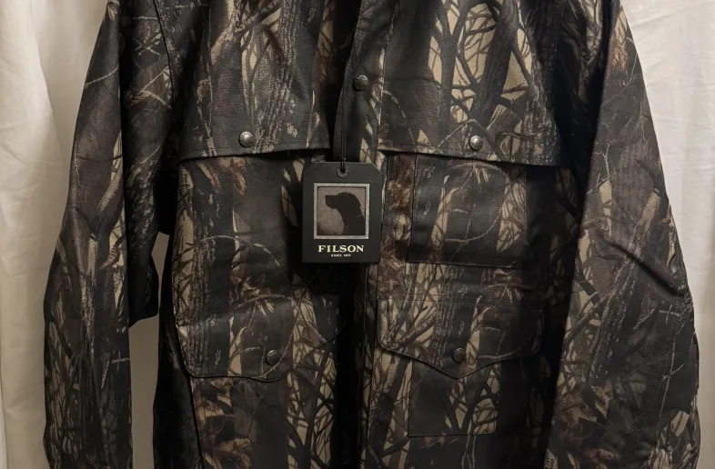 Brand new Filson RealTree Hardwoods Camo Tin Cloth Cruiser with tags still attached. Fits like a large. This jacket has been pre-waxed from the factory hence its water repellant and is warm due to the primaloft insulation.