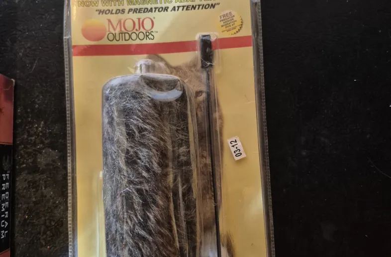 Mojo critter predator decoy. Comes with homemade stand. Also includes original spike to hold it . Runs on 4 aa batteries. No shipping. Cone with original package. $40