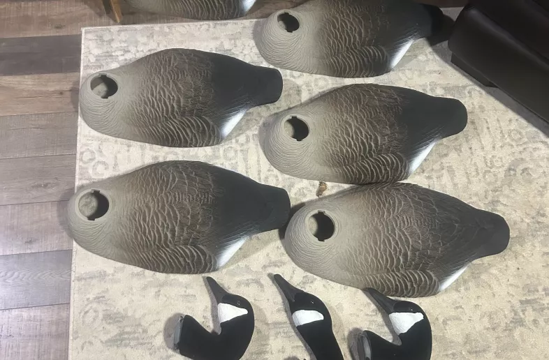 6 shell body field geese in a resting position. Head positions vary, may have used them once. Few tiny marks on the flocked heads from being shuffled around my hunting room, nothing crazy.