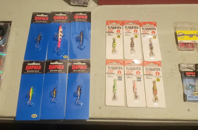 Looking to downsize some of my ice fishing kit, selling duplicates and stuff I haven't been using, all brand new and in original packaging. Various weights and sizes, hoping that the labels are legible but please let me know if you'd like more info!
