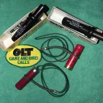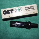 The first call is the more difficult to find P.S. Olt D-2 Regular Duck call with the factory installed round depression in the insert tone channel that was meant to help rid the call of moisture. Also included is a P.S. Olt W-12 Widgeon/Pintail whistle duck call and a rare unused Olt crest. Both of these Olt calls I believe were from the 80's.