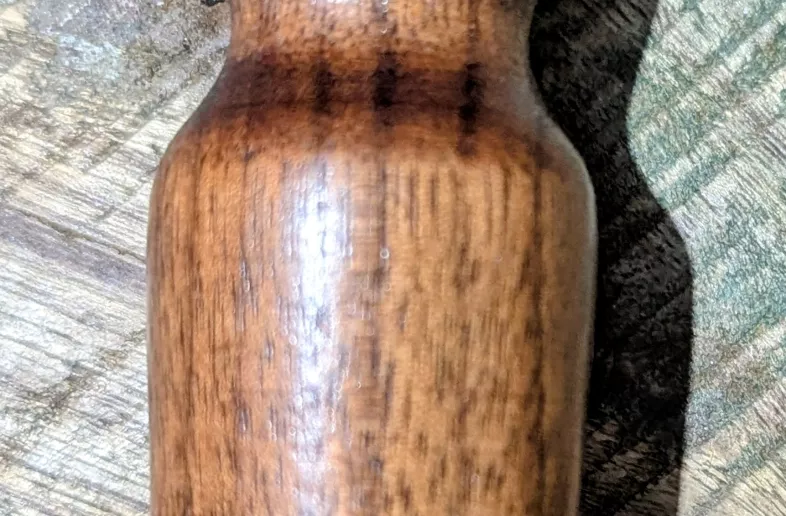 Hand-turned Walnut Predator Call — Closed-Reed Rabbit/Rodent Distress Coaxer, 9cm.Mouth end = the side with the gray insert/X.