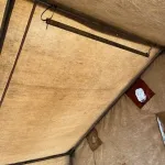 Light discolouration on canvas back wall from stove. Does not compromise the canvas quality