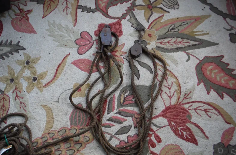 Nice four part block and tackle. Nice small set, easy to carry. Four part block makes lifting a heavy animal by yourself simple. Also has a built in brake, so no need to tie it off. As well the hanging hook has a built in sheave to hang of a rope or cable without an eye, as per the picture. Price plus shipping