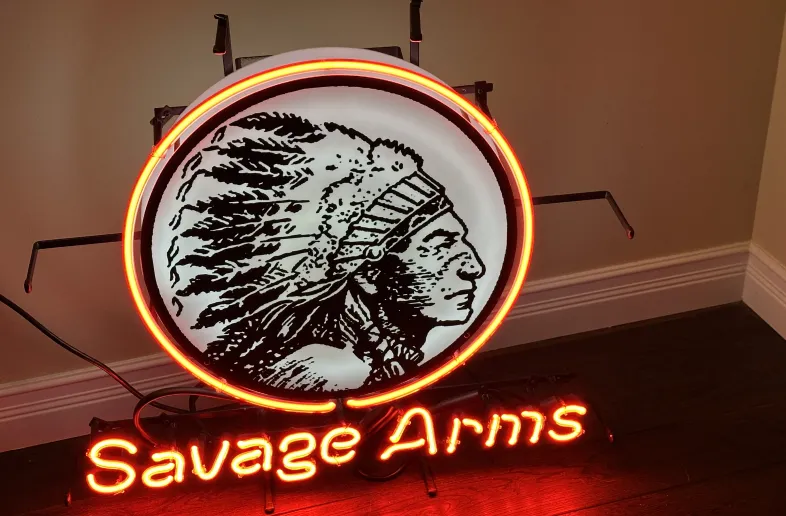This was an original sign that was used for marketing Savage Arms in a gun store. Excellent for any man cave or gun room. Everything it and it has an off pull switch. It can free stand on its own or there are different of securing it to a wall .