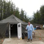 Army tent thick green canvas good shape no tears comes with 2 main beam wooden poles and 4 wooden poles for doors doors are at either end of tent and 10 or so wooden poles ft the sides comes with tent pegs and ropes to secure tent also comes with wooden doors for easy access in and out great for moose hunting or deer for that matter shipping extra