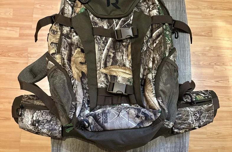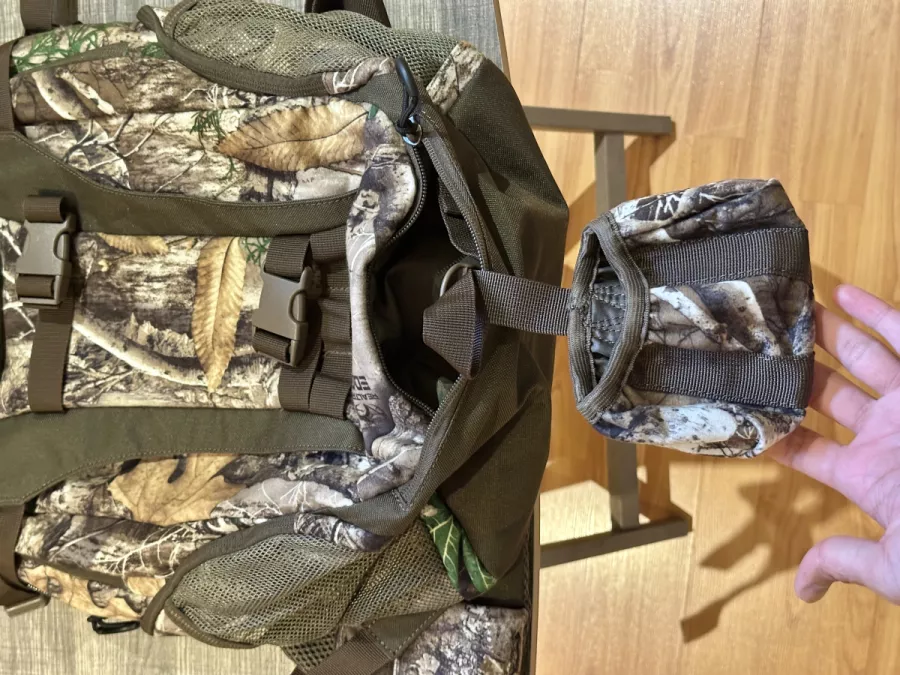 Has several pockets, and a pouch to carry guns. Fabric is of great quality and the backpack is heavy.