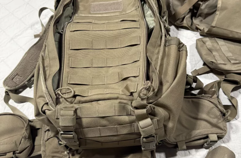 G3 Phantom Sniper pack. Removable rifle back with extra should harness. 2 small, 2 large, 1 xl and 1 deluxe padded pouches, 2 side saddle bags, 2 1L pouches, scabbard cover, dry bag. Molle soft Shooting rest. All in Dry Earth. Unused.
