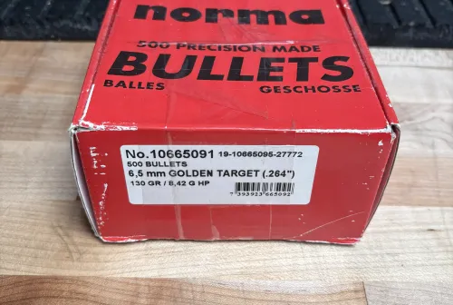 375.00 Norma Golden Target .264 / 6.5 mm 130 gr - Box of 500 Feb 27, 2026 - 7:14 AM LivelyGuy Up for sale is a box of Norma Golden Target .264 / 6.5 mm 130 gr bullets.