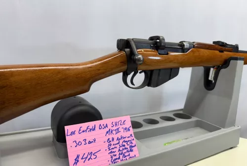425.00 Lee Enfield BSA SHTLE MK III “1916” Oct 22, 2025 - 6:52 AM Lenore Lee Enfield BSA SHTLE MK III “1916” in .303 British bolt action with removable metal 10 round mag