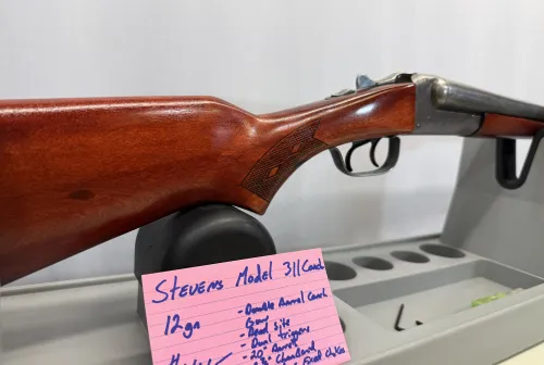 446.00 Stevens Model 311 Coach Jan 3, 2026 - 10:35 AM Lenore Stevens Model 311 Coach in 12 ga double barrel in good condition, stocks are very good but bluing