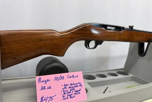 SOLD 475.00 Ruger 10/22 Carbine Jan 3, 2026 - 11:38 AM Lenore Ruger 10/22 Carbine in .22 LR semi automatic with removable rotary magazine in good condition.