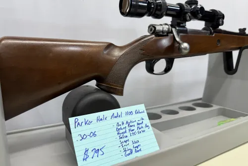 796.00 Parker Hale Model 1100 Deluxe Mar 7, 2026 - 5:17 AM Lenore Parker Hale Model 1100 Deluxe in .30-06 bolt action with deluxe Rams Head hinged floor plate maga