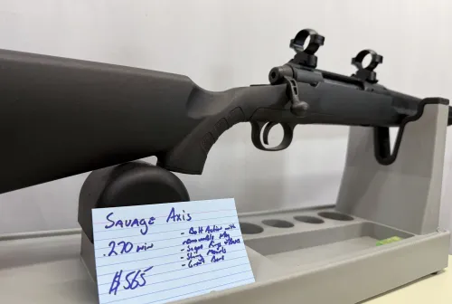 565.00 Savage Axis Mar 24, 2026 - 10:39 AM Lenore Savage Axis in .270 win bolt action with removable magazine in Very Good Condition.