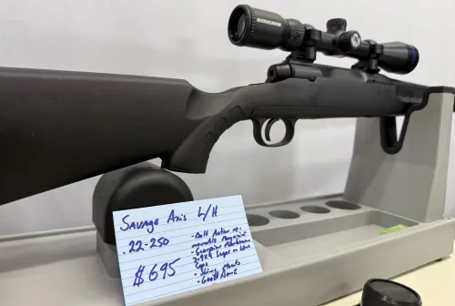 695.00 Savage Axis Left Handed Mar 24, 2026 - 10:57 AM Lenore Savage Axis Left Handed in .22-250 in very good condition with typical hunting usage marks.