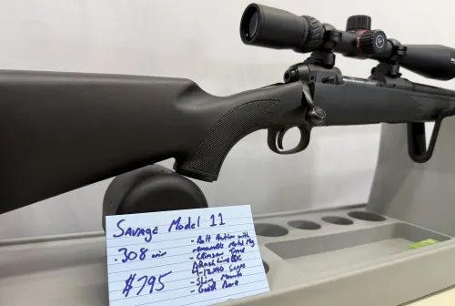 795.00 Savage Model 11 Mar 24, 2026 - 11:07 AM Lenore Savage Model 11 in .308 win bolt action with removable metal magazine in Excellent condition.