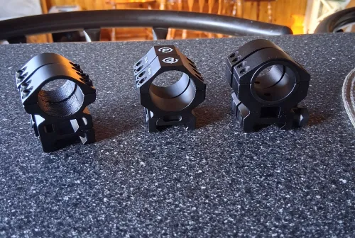 45.00 Scope rings Feb 28, 2026 - 5:51 AM Cmhiltz For sale. 3 pair scope rings. 1 pair of 1" medium. (Left). 1 pair 30mm medium (center).