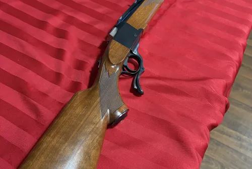 RUGER NO.1 chambered in 7MM08 , 22 inch barrel with open sights and nice Walnut stock .