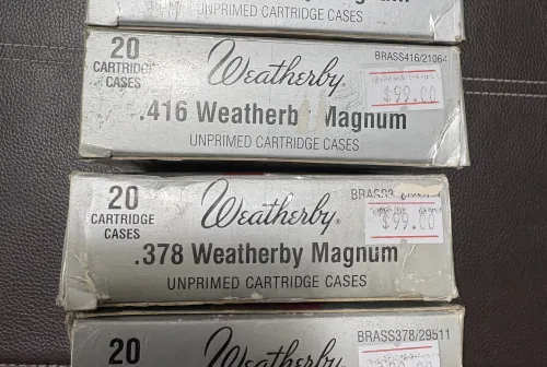 99.00 WEATHERBY BRASS 416 Jan 20, 2026 - 6:09 PM mr.weatherby Brand new unprimed Weatherby brass in 416 Weatherby Magnum , $99 per 20 plus’s shipping .