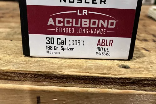 90.00 Nosler 168gn Accubonds LR 30cal Nov 19, 2025 - 1:55 PM andrew.borsato Selling a opened box of nosler 168gn accubondsLR 30cal there are 82 projectiles in the box